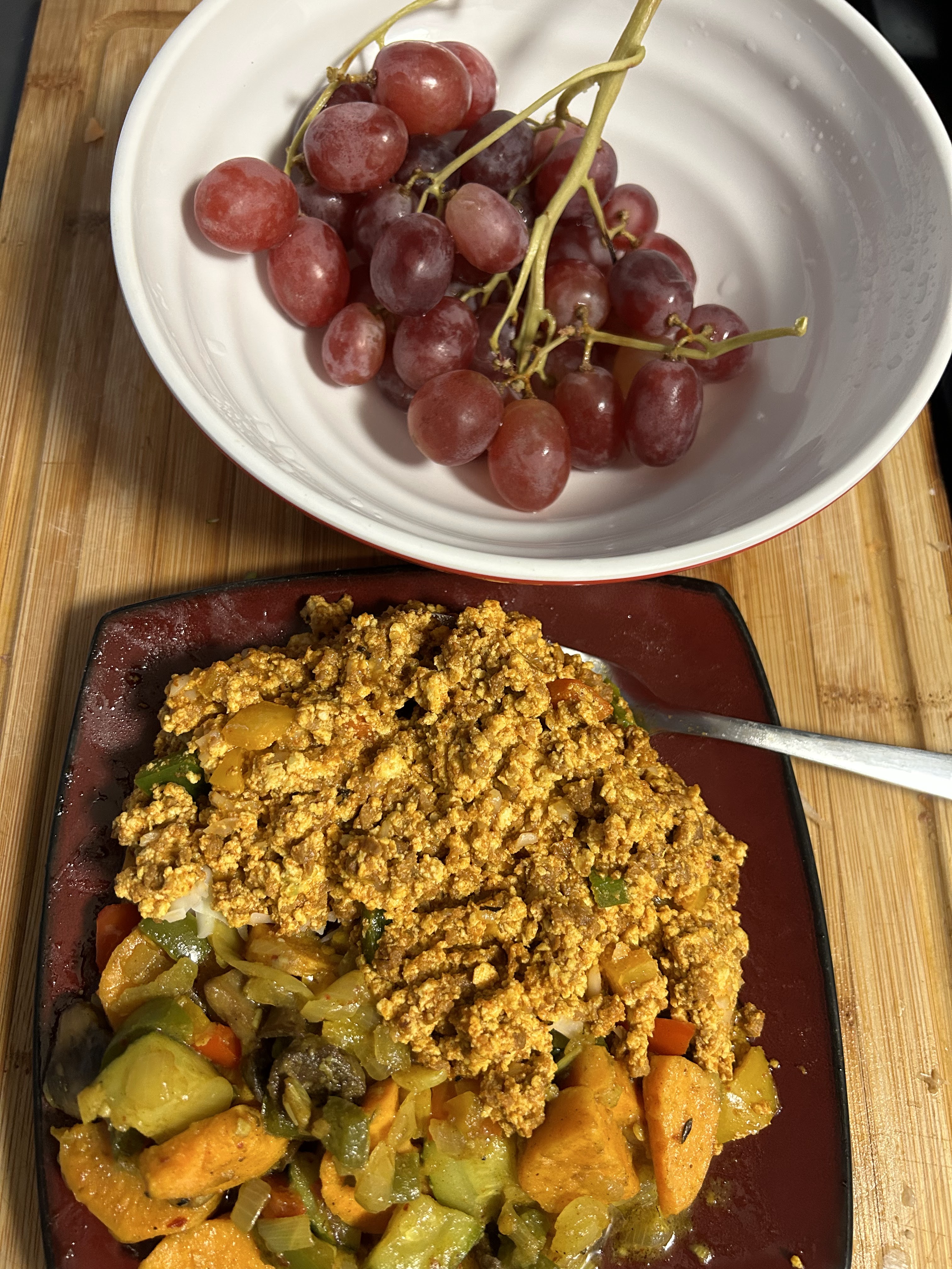 This is a vegan tofu scramble with Jamaican curry and veggies (sweet potato, zucchini, mushrooms, onions and garlic). The cool thing about doing this challenge is that I get to have fun coming up with cool meals :), instead of ordering out when I don’t feel like cooking 😮 LOL.
